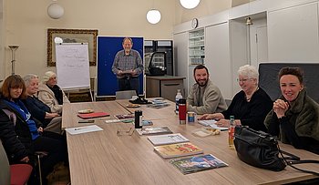 Andreas erinnerte an den im Oktober 2025 verstorbenen Brian J. Corrette, der am 16.02.2026 auf dem Parkfriedhof Lichterfelde beigesetzt wurde. Dabei blickte seine Ehefrau Petra auf den vielschichtigen Lebensweg von Brian zurück und schilderte einige Anekdoten aus seinem wissenschaftlichen Berufsweg sowie private Ereignisse. Zwischendurch waren Musiktitel nach dem Geschmack von Brian zu hören. Petra und Brian gehörten zum Stamm unserer Selbsthilfegruppe und wir verbrachten viele angenehme Stunden miteinander, in denen wir uns über vielerlei Themen austauschen konnten. Noch eine Woche vor seinem überraschenden Tod waren wir bei einer Dampferfahrt zusammen unterwegs. Er fehlt uns.