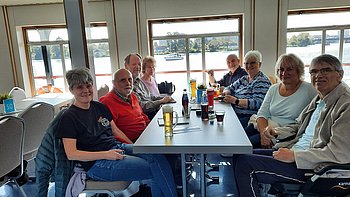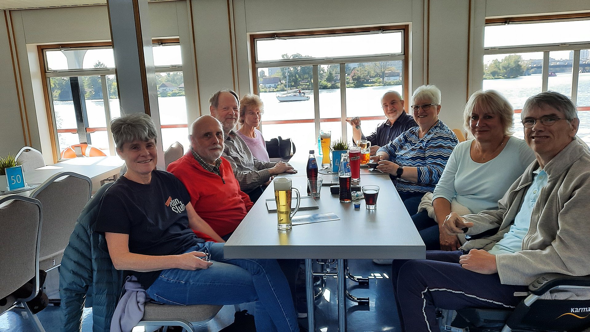 Der Spätsommer meinte es gut mit uns: mit Sonnenschein wurden wir im Norden von Berlin am 27. September 2025 in Tegel empfangen. Zu unserer Überraschung fand dort auf der Greenwichpromenade das Tegeler Hafenfest statt, dass Ende Juli 2025 wegen massiver Sturmschäden aus Sicherheitsgründen abgesagt werden musste und nun auf dieses Wochenende verschoben wurde. Das hatte zur Folge, dass es schon zu Beginn sehr voll war, wir uns aber in der Menschenmenge dann doch noch finden konnten. Unsere zweistündige Rundfahrt mit dem MS Havel Queen startete pünktlich in den sonnigen Nachmittag und führte uns an Reinickendorfer Ortsteilen sowie Spandau vorbei an die Brandenburger Landesgrenze nach Nieder Neuendorf. Nach dortigem Anleger erfolgte die Wende und es ging wieder zurück an Tegelort vorbei bis nach Tegel. Natürlich gab es zwischendurch einen kleinen Imbiss und wir freuten uns über den gemeinsamen Nachmittag. Zurück auf der Greenwichpromenade nutzten wir noch die Möglichkeit, die kulinarische und musikalische Angebote des Hafenfestes zu genießen. Es war ein schöner Ausflug in den Berliner Norden.