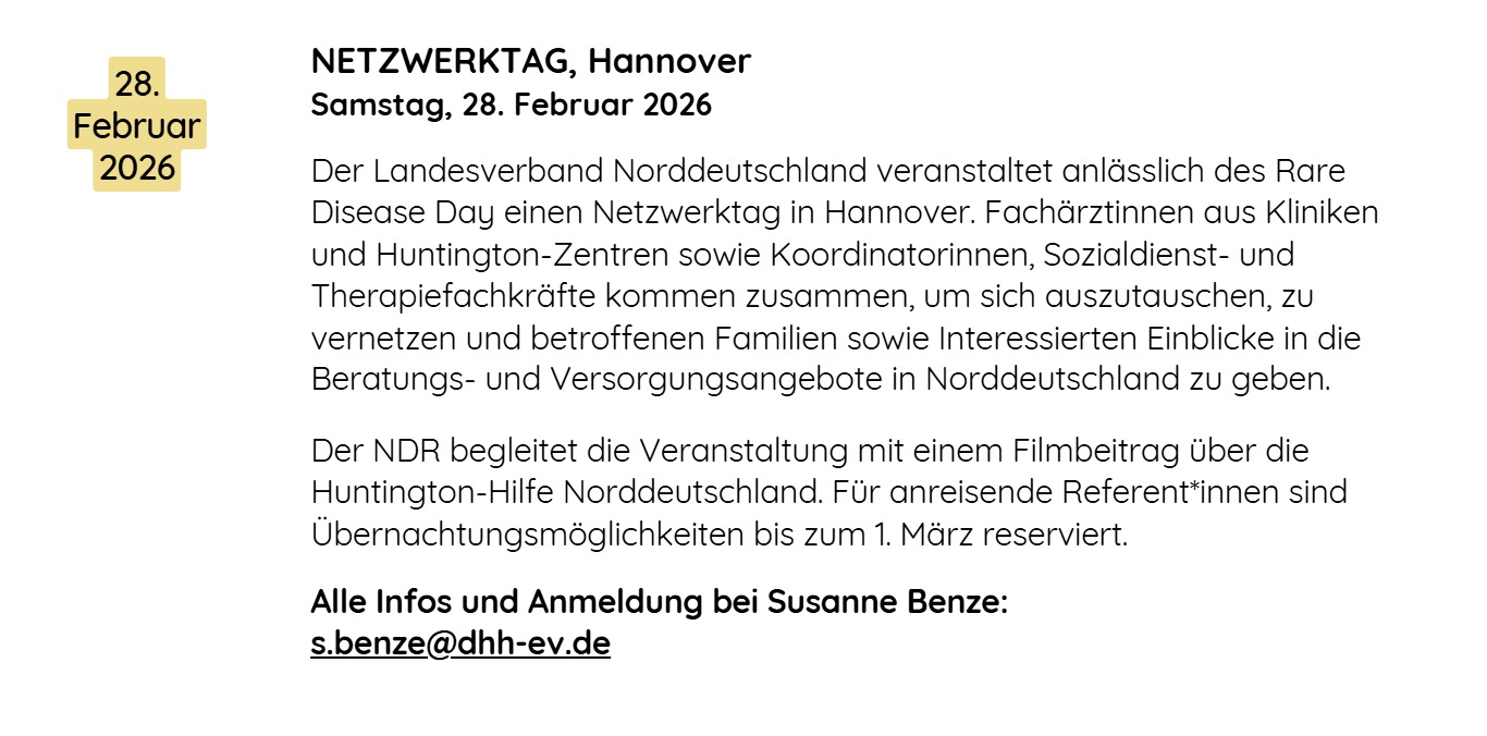 Am Tag der Seltenen Erkrankungen – dem „Rare Disease Day“ möchte die Selbsthilfegruppe Hannover einladen zu einer Tagesveranstaltung, bei der sich Teilnehmer*innen der Selbsthilfegruppe sowie Interessierte aus therapeutischen Berufen sowie aus dem privaten Umfeld der Region ein Bild über die Versorgung und die Hilfsangebote für Menschen und Familien, die von der Huntington-Krankheit betroffen sind, machen können.